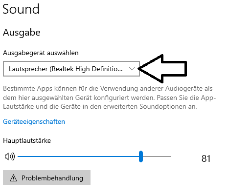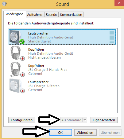 3. In der Liste das passende Ausgabegerät auswählen, unten auf „Als Standard“ und anschließend auf „OK“ klicken