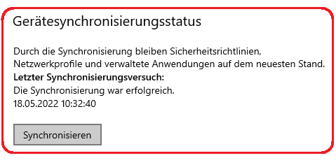 - Scrollen Sie im nächsten Schritt runter bis zum Gerätesynchronisierungsstatus und klicken dort auf „Synchronisieren“